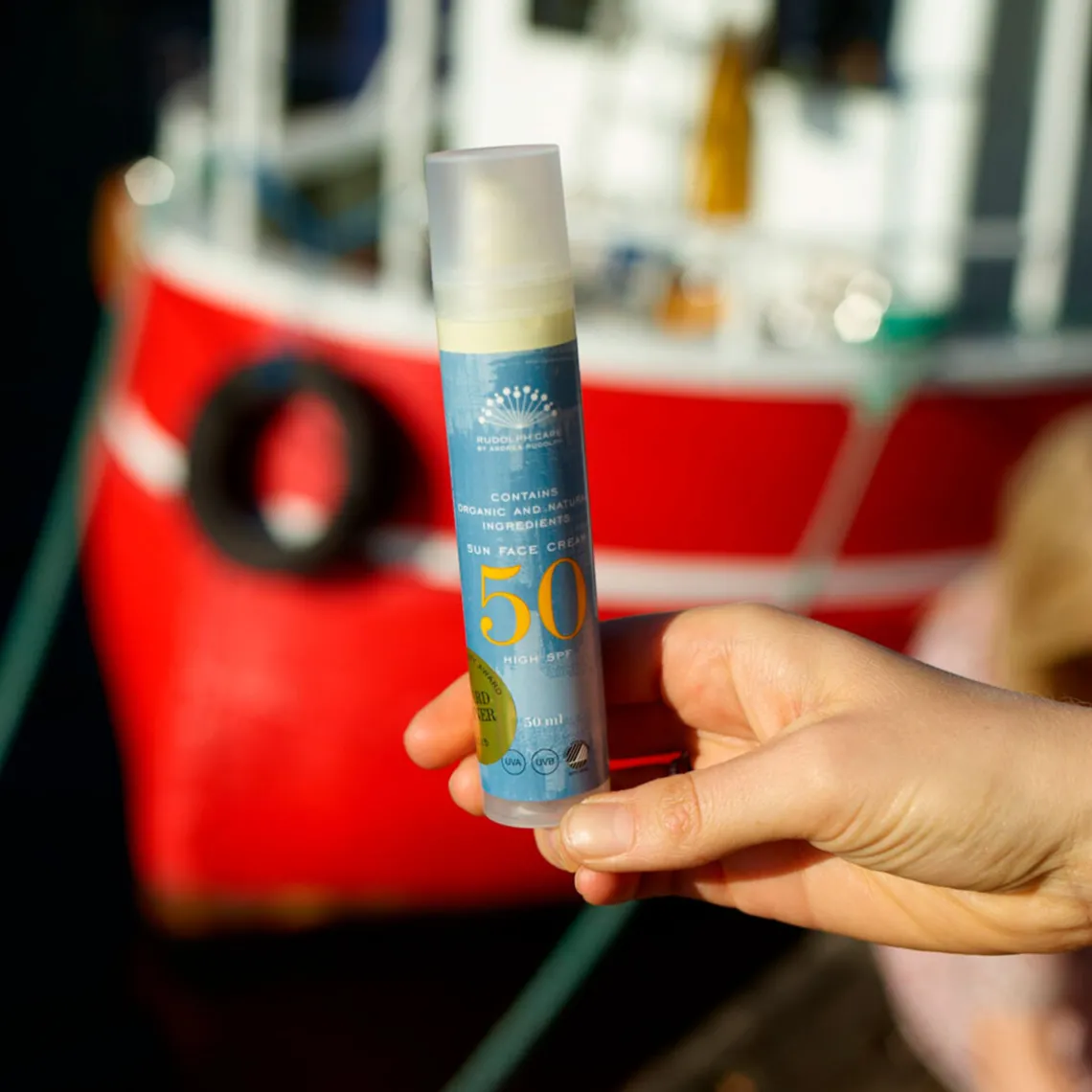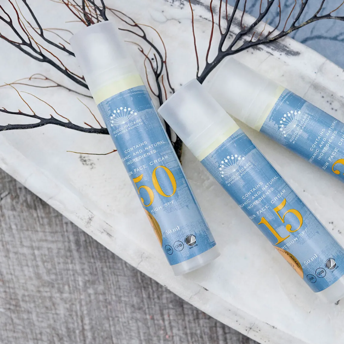 Sun Face Cream SPF 50 fra Rudolph Care er en rig og plejende solcreme til ansigtet, der beskytter optimalt mod solens skadelige UVA- og UVB-stråler. På samme tid er den en nærende ansigtscreme, og den kan derfor erstatte din dagcreme i forårs- og sommermånederne Produktet indeholder mange naturlige og aktive ingredienser, bl.a. kamille, der lindrer og beroliger, agurkeekstrakt, der opstrammer og tilfører fugt, hvedekim, der har en naturlig antioxidanteffekt og koncentreret æbleekstrakt, der effektivt fornyer celleproduktionen, så huden bevarer sin spændstighed.