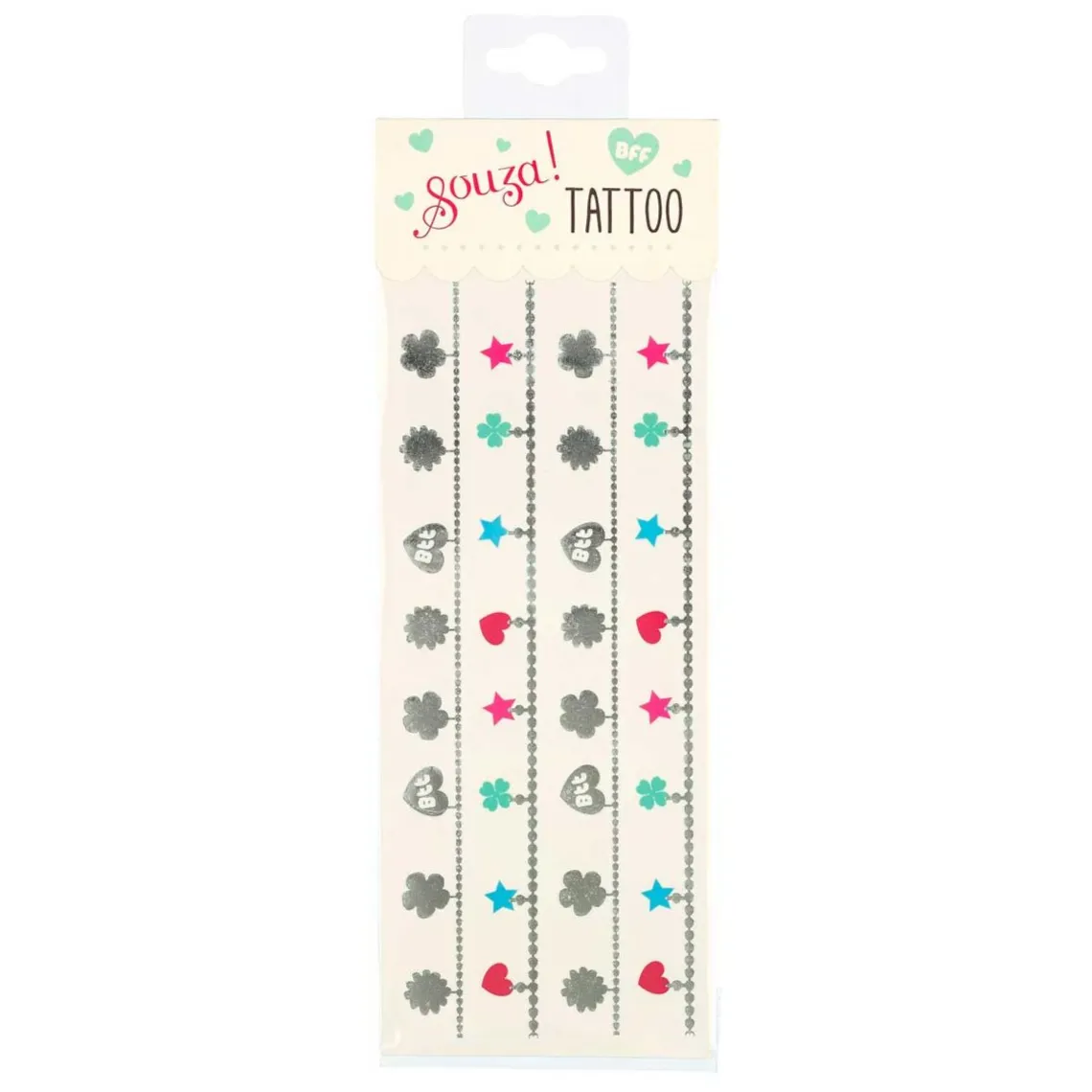 Tatoveringer fra Souza. Her får du en pakke som indeholder tatoveringer. Tatoveringer er en sjov både for børn at udforske tatoveringer, og de fleste børn elsker dem. De er nemme at sætte på, og går hurtigt væk igen.
