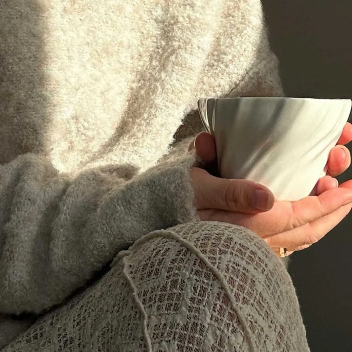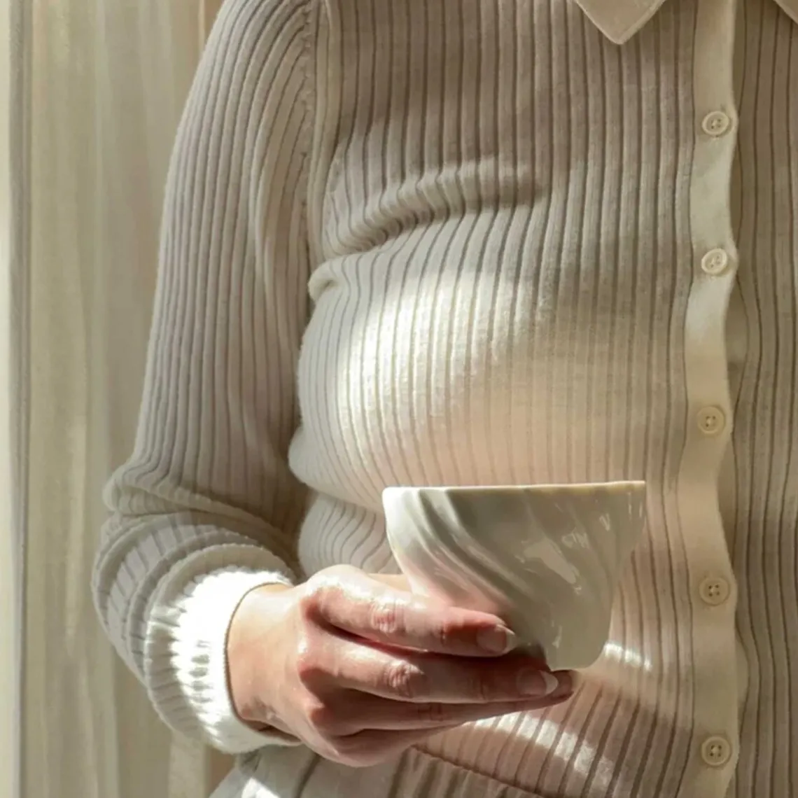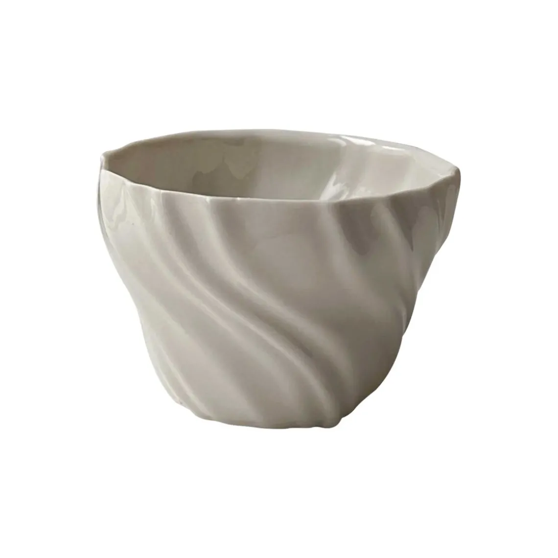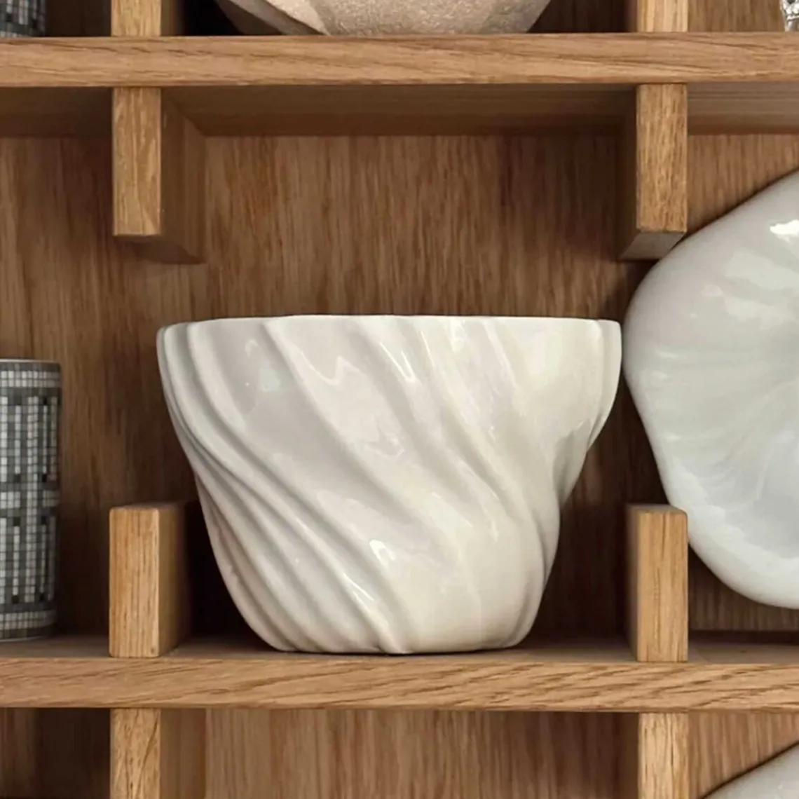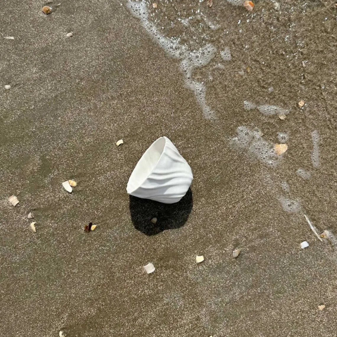 Overfladen er inspireret af den bølgede sandbund, som opstår, når vandet trækker sig tilbage og blotter havbunden – et særligt og sanseligt udtryk fra et foranderligt landskab. Da hver kop er håndlavet, kan der forekomme små variationer, hvilket gør hver enkelt unik. Materiale: porcelæn