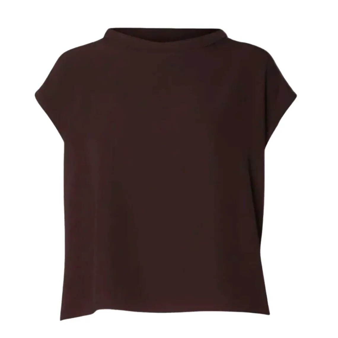 Top fra Imperial i lækkert materiale. Toppen har korte ærmer, som kun lige dækker skulderen og uden skuldersøm. Toppen har et boxy fit. Den har en rund hals med en opretstående kant, som gør den mere speciel. Desuden har toppen et lille slids i begge sider.