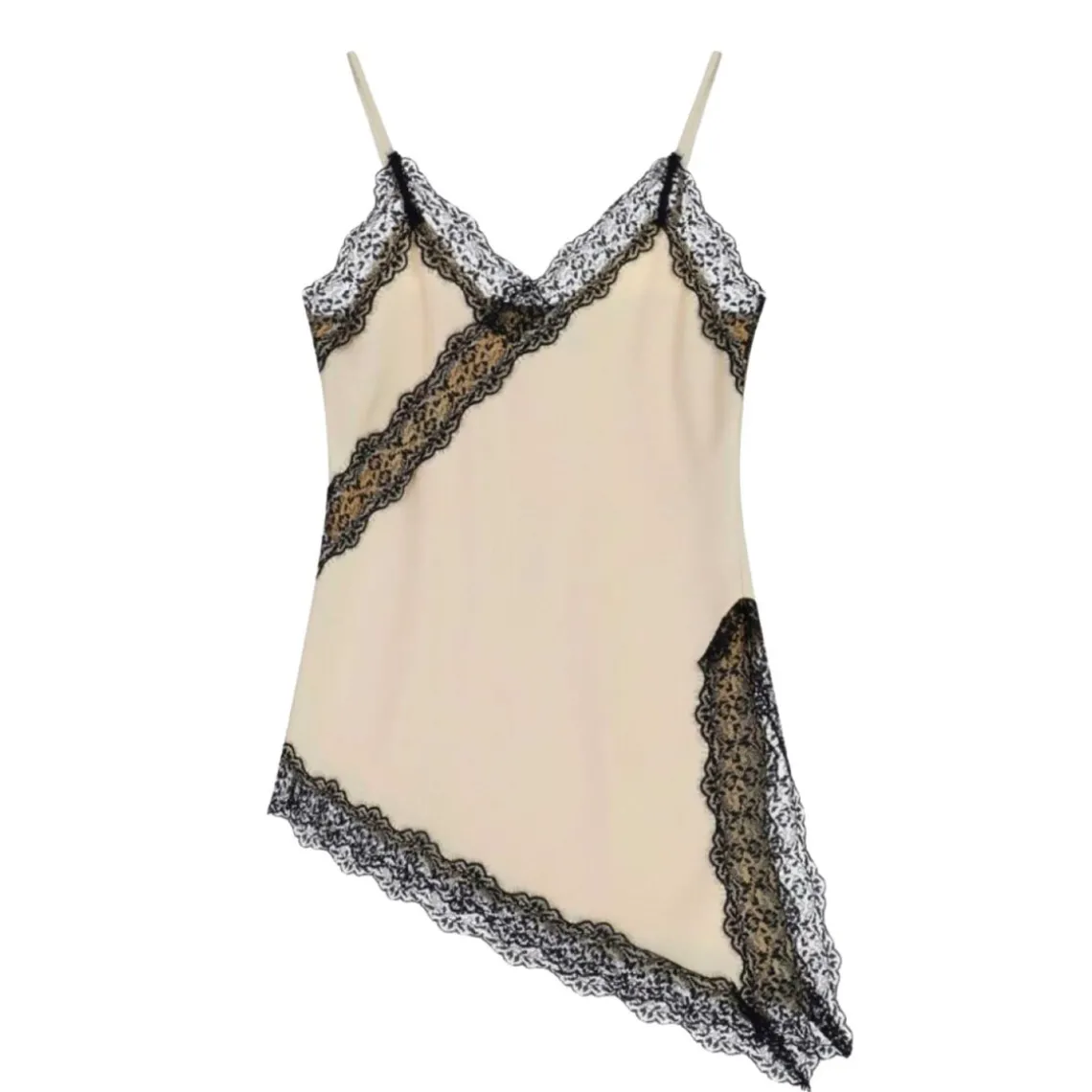 Smuk top fra Imperial med sort blondedetaljer. Toppen har v-udskæring og justerbare stropper. Den har et asymmetrisk snit og et slids i siden, som også er pyntet med blonder. Toppen er perfekt til festlige anledninger og kan styles på mange måder.