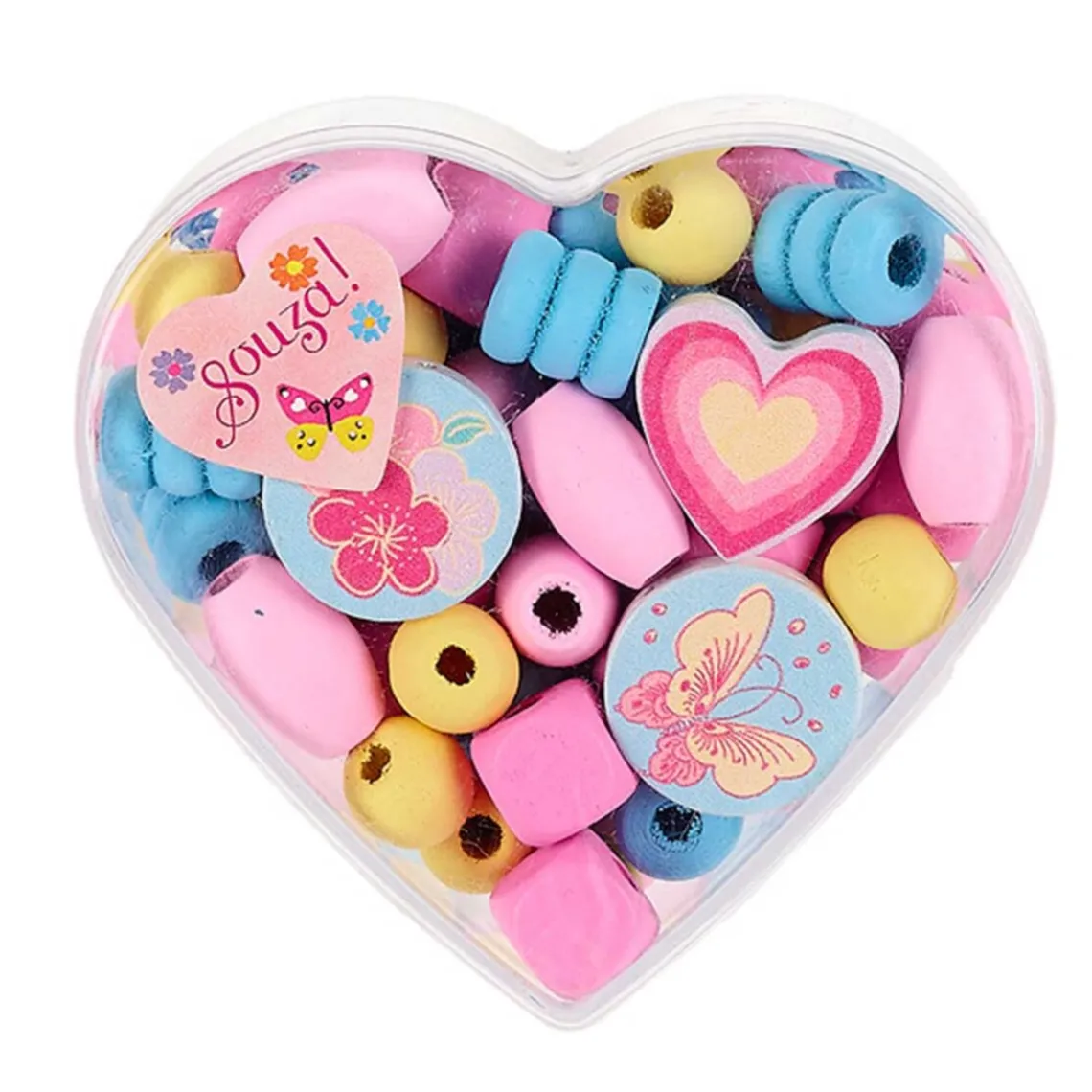 Træperler i hjerteæske fra Souza. Her får du en super fin hjerteæske som indeholder forskellige træperler, du f.eks. kan bruge når du skal lave dine egne smykker.
