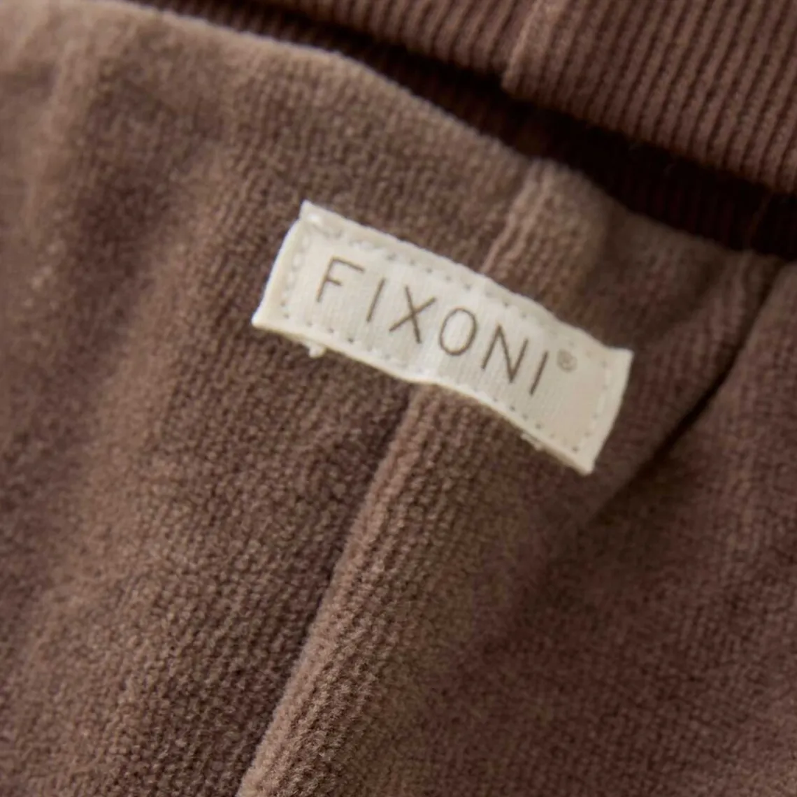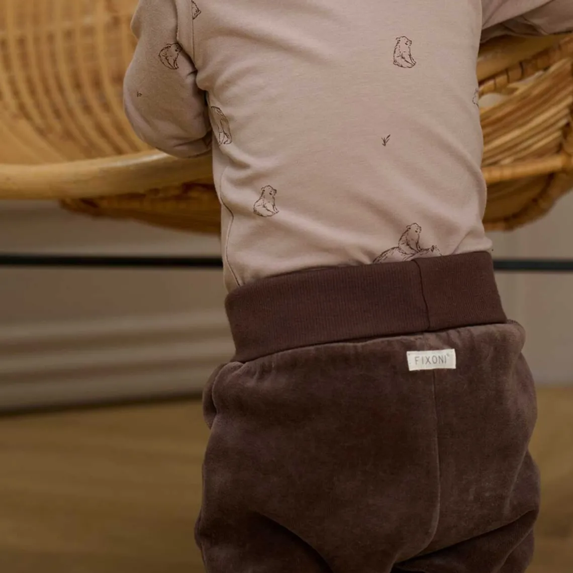 Bløde bukser fra FIXONI i ensfarvet velourkvalitet, der føles dejligt blød og behagelig mod huden. Bukserne har brede ribkanter ved benene og i taljen, som kan foldes efter behov for ekstra komfort og en god pasform. Perfekte til både hygge og hverdagsbrug. Materiale: 100% bomuld