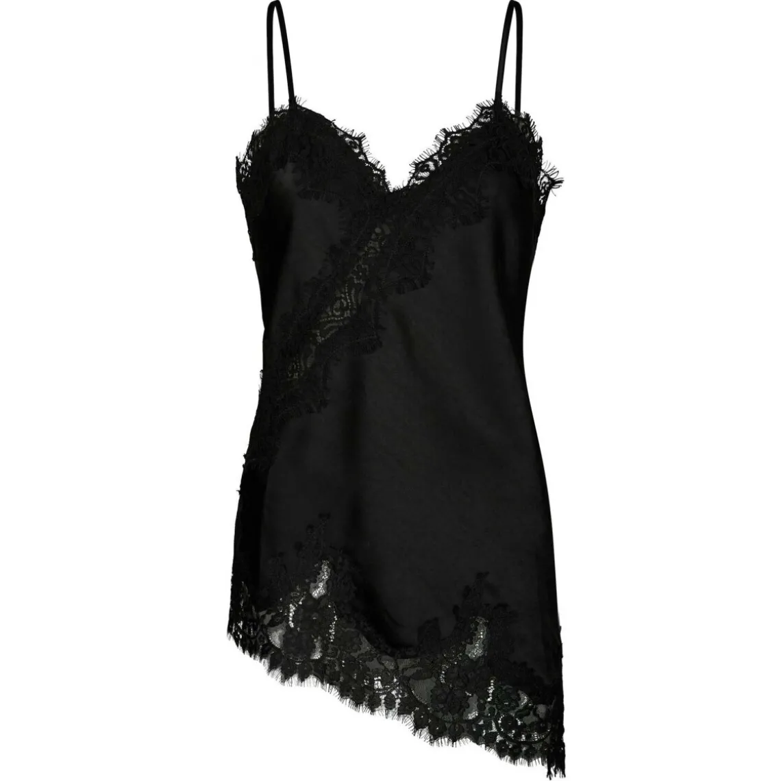 Denne feminine top kombinerer elegance og detalje med en asymmetrisk pasform og smukke blondeindslag, der skaber et let og sofistikeret udtryk. Toppen er fremstillet i en fin satin-kvalitet, som både føles luksuriøs og falder flot på kroppen. Perfekt til både hverdag og festlige lejligheder, hvor du ønsker et feminint touch. Materiale: 97% polyester, 3% elastan