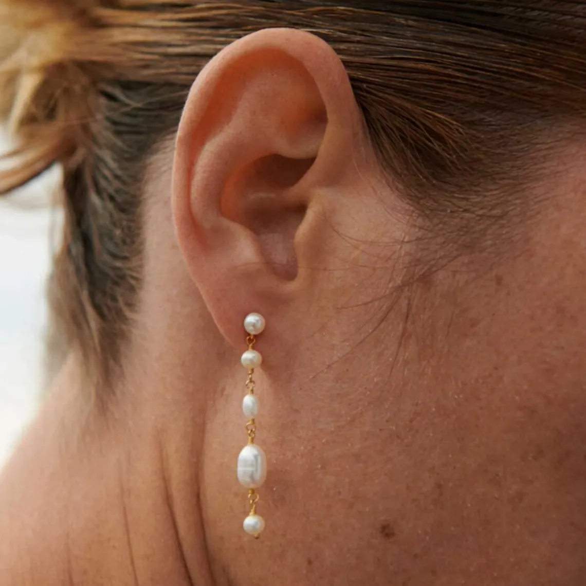 De flotte White Dreams øreringe, designet af Pernille Corydon, er udsmykket med hvide perler i forskellige størrelser og former.