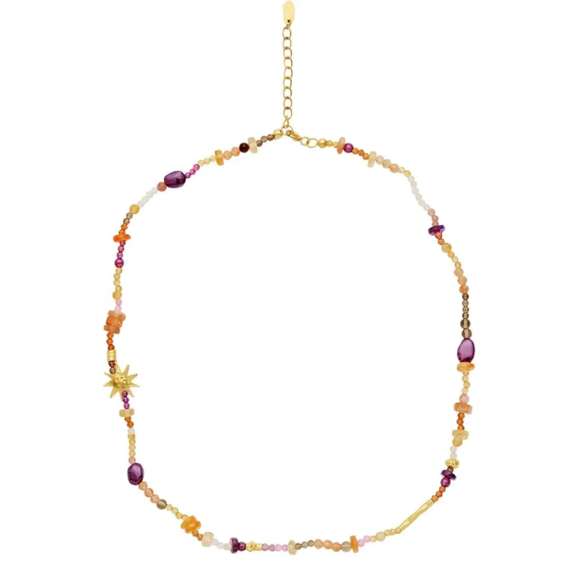 Materiale: genanvendt sterlingsølv forgyldt med 18 karat guld, citrin, solsten, rund granat, hesesonit granat, pink turmalin, rød onyx, tigerøje, regnbuemånesten, røgkvarts