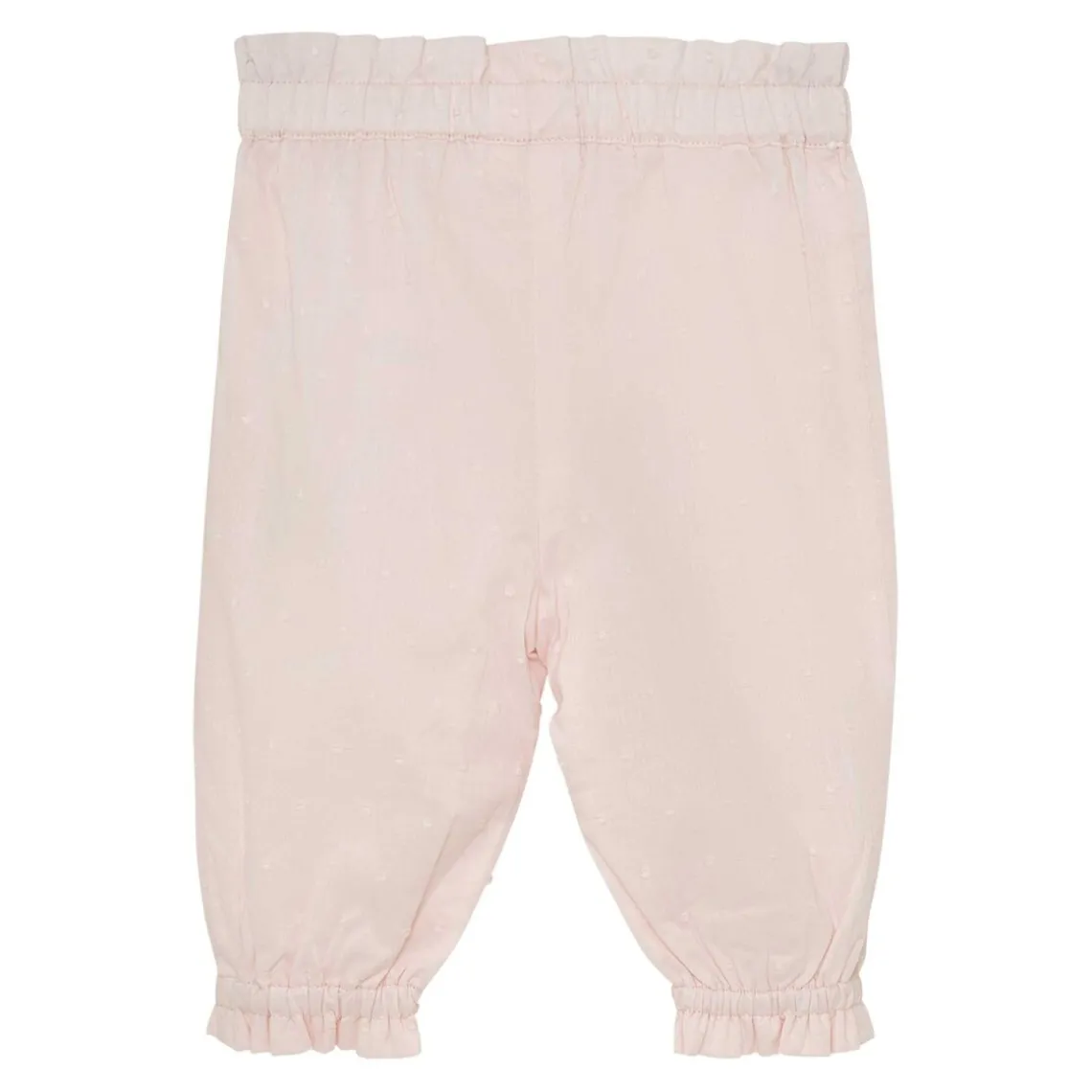 Løse, ensfarvede bukser fra FIXONI i blød bomuldskvalitet. Bukserne har elastik og flæsekant ved både talje og ankler, hvilket giver en komfortabel pasform og en sød, afslappet stil. Materiale: 100% bomuld