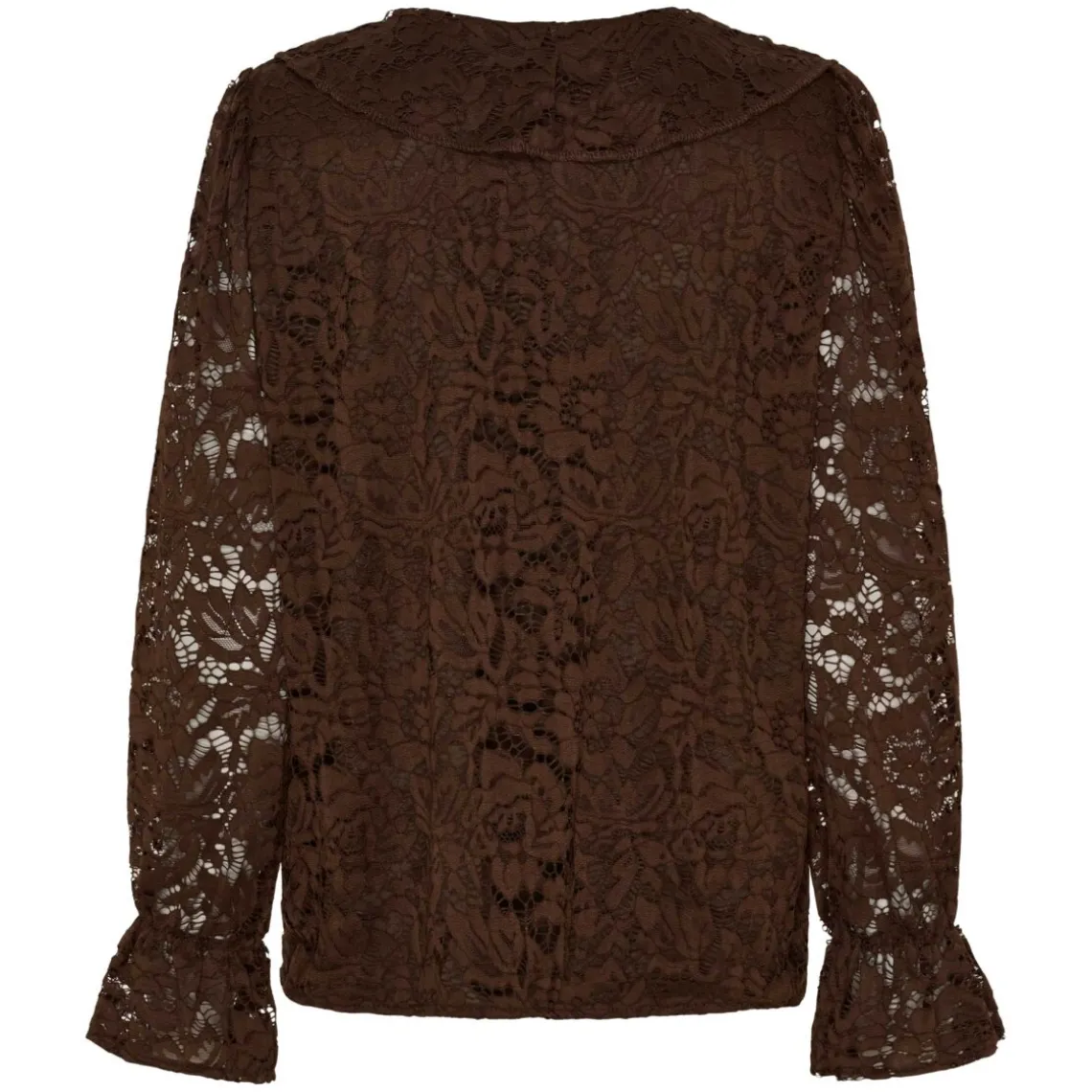 Elegant blondebluse med smukt blomstermønster og feminine flæsedetaljer. Den har V-hals, lange ærmer med elastiske manchetter og et gennemført blondelook, der gør den velegnet til både hverdagsbrug, arbejde og festlige anledninger. Materiale: 100% polyester